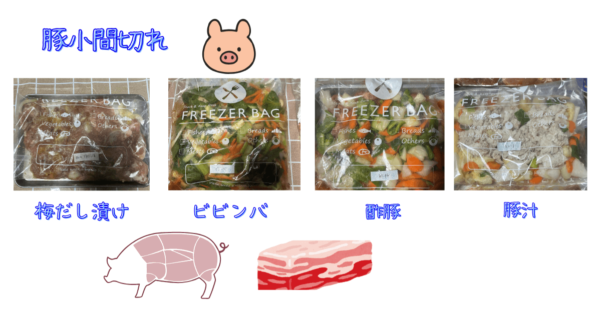 ビビンバ・酢豚・豚汁…豚切り落としの半調理冷凍。凍ったまま調理します