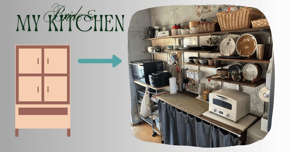ここで問題になるのが、必要な物をごちゃごちゃした引出しの中から探し出す無駄な時間。そこで、見えていれば探さなくで済むという観点から40年共にした食器棚を解体して上半分は粗大ごみに出し、下半分の収納部分は作業台としてDIYして見事に復活。何も無くなった上部分は壁に棚を取り付けて食器やグラス、調味料や乾物など探さなくても「振り向けばソコにある」状態に…